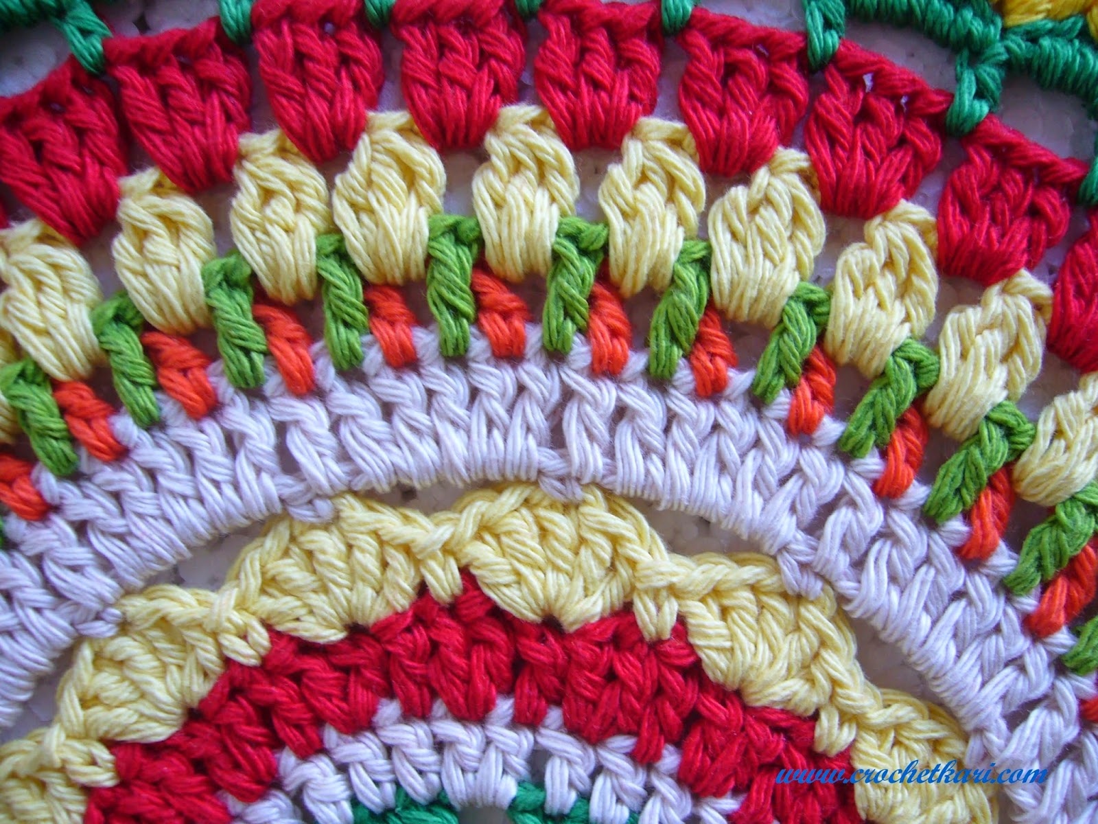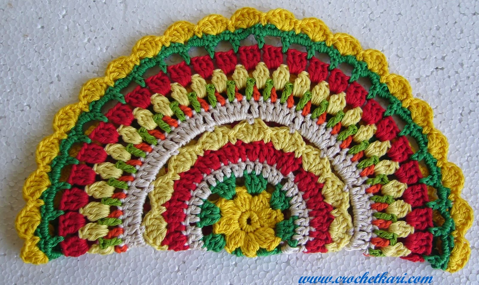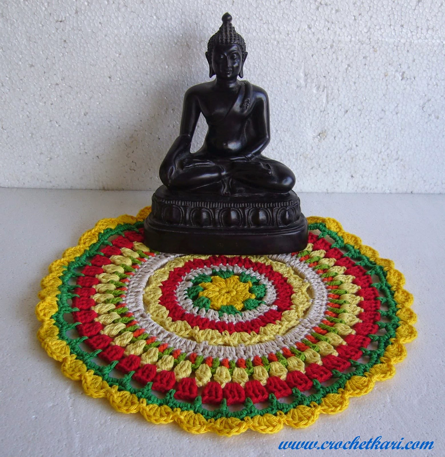 Once again I have used Laura knitting cotton and a 3.5mm hook. I hope you will try this pattern. And if you do make your own mandala, feel free to share your pictures on my Facebook page. I hope you are already a fan of my Facebook Crochetkari page, if not then don't forget to "Like" my page as I always reveal my latest projects there first, before I find time to blog about them. I find it a fast way to share my creations and then I add all the project details and pattern links in my blog post. If you have any questions about this pattern or crochet in general, write to me at crochetkari@gmail.com