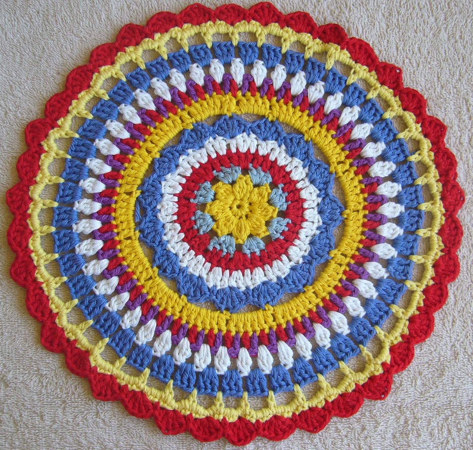 If you would like to have a go at it, the pattern details can be found in my original Vibrant mandala post. It is definitely worth a try as it is a very happy design. I made the first mandala as part of a crochet-a-long and as you can see there were some really funky colour combinations. So go ahead and make it in your own favorite colours!
